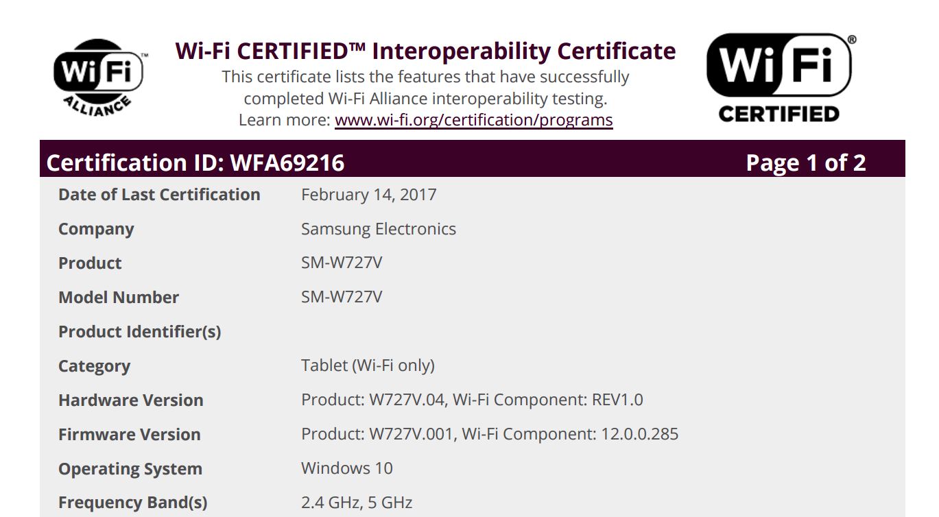 Dosud nepředstavený tablet značky Samsung byl dnes v ranních hodinách spatřen v online databázi Wi-Fi Alliance. Jak je již zvykem, dokumentace neodhaluje bližší specifikace o tomto zařízení. Jediné, co jsme zjistili, je modelové číslo SM-W727, což naznačuje, že by se mohlo jednat o 4G-LTE verzi tabletu Galaxy S2 TabPro s Windows 10.