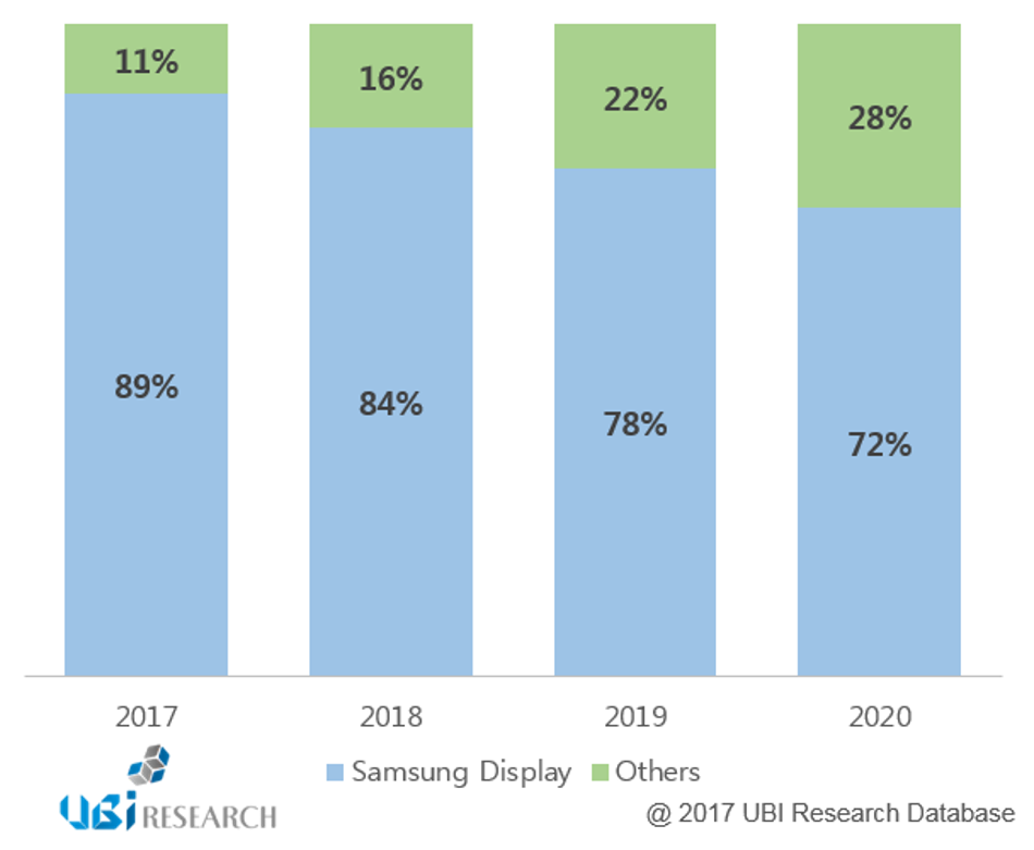 Podle zprávy od serveru UBI Research, bude podíl jihokorejské společnosti Samsung na trhu s OLED displeji do roku 2020 činit 72 procent. Výzkumná firma, která se na toto téma zaměřila, očekává ohromný globální nárůst prodejů zobrazovacích panelů typu OLED. Ke zmíněnému skoku by mělo dojít ještě letos