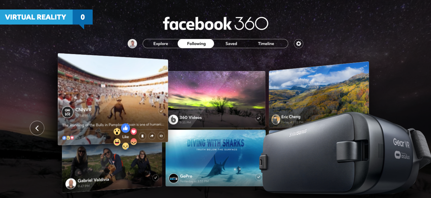 Společnost The Mark Zuckerberg-run prohlásila, že během několika měsíců přinese podporu 360stupňových fotografií a videí také pro Gear VR (který je poháněn systémem Oculus VR). Oficiální aplikace Facebook 360 obsahuje hned 4 základní části: