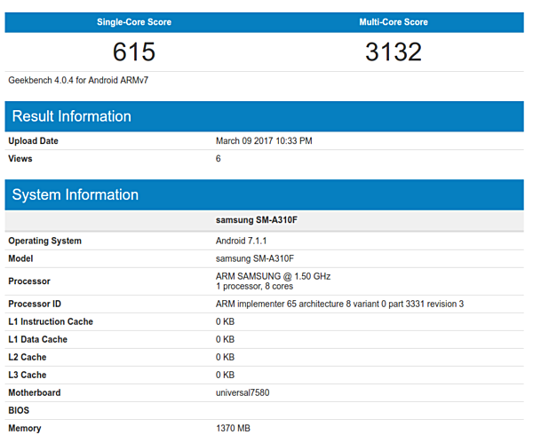 Nyní se v databázi velmi populární a oblíbené aplikaci Geekbench telefon s novým systémem objevil a prozrazuje mnoho zajímavého. Galaxy A3 (2016) si v testech vedlo o něco lépe, než se systémem Android 6.0. V klasickém testu pro single-core dosáhl telefon 615 bodů, zatímco při použití všech jader 3132 bodů.