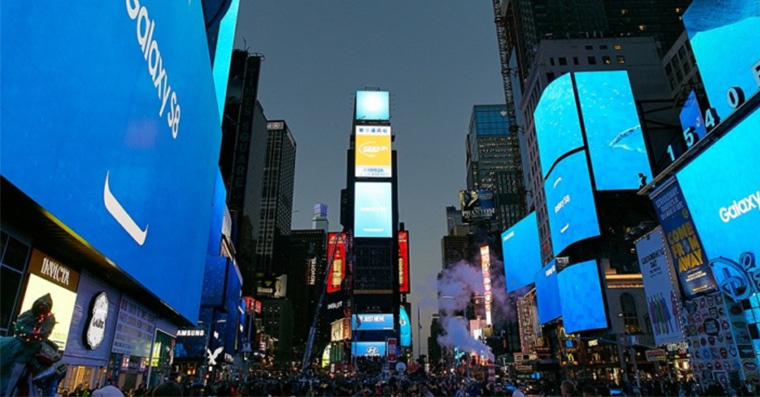 Níže můžete na fotografiích vidět, jak je ikonický Times Square v New York City doslova vytapetovaný velkými displeji, na kterých se zobrazuje na modrém pozadí silueta vlajkového modelu Galaxy S8 s tzv. Infinity, nebo-li nekonečným, displejem. Samsung koupil téměř všechna inzertní místa, za což musel zaplatit nemalý obnos peněz. Konkrétní čísla bohužel známa nejsou.