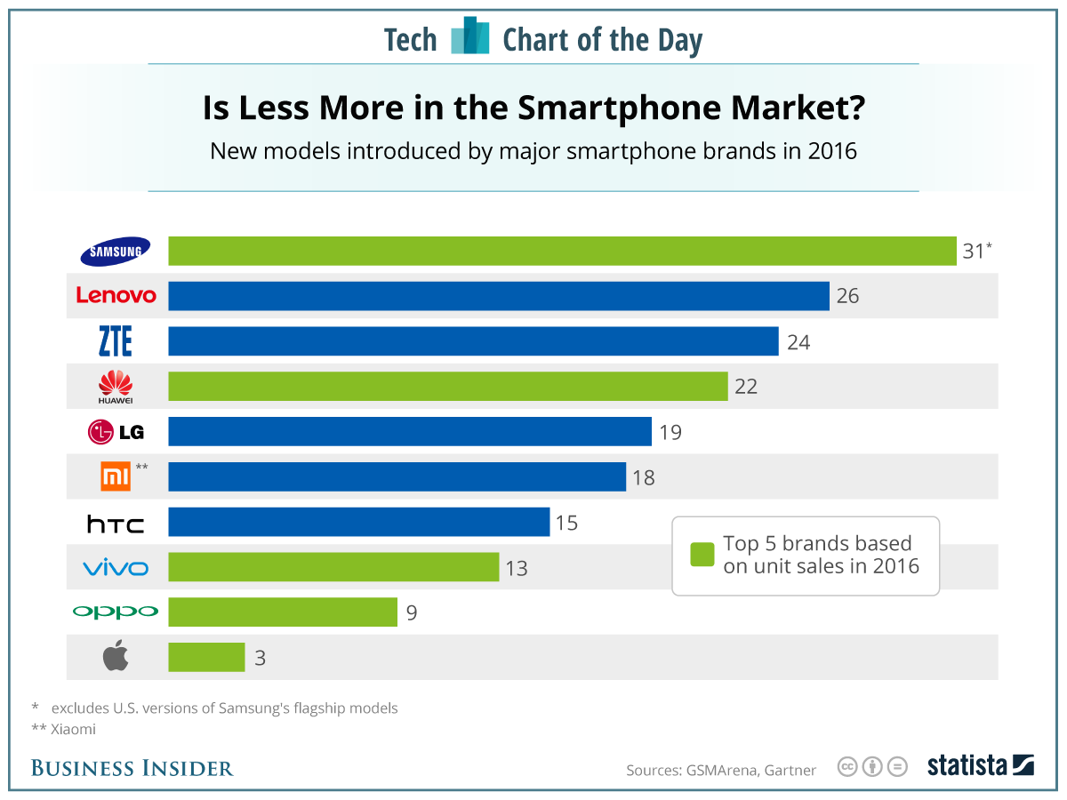 Samsung byl v minulých letech často kritizován, že má na trhu snad stovky různých telefonů. Trochu úsměvné je, že podobné hyperbolizace nebyly zase až tak daleko od pravdy, i když samozřejmě nadnesené byly. Například před dvěma lety zaplavila společnost trh celkem 56 novými telefony. Nakonec šel ale Samsung po špatných finančních výsledcích v roce 2016 do sebe a svou nabídku mírně ořezal, zpřehlednil a tím i zjednodušil. V roce 2016 jsme se tak dočkali „jen“ 31 nových chytrých telefonů (včetně Galaxy S7 a S7 edge), ovšem i to bylo ze všech výrobců nejvíce.