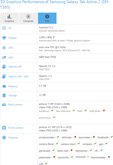 Robustní Galaxy Tab Active 2 je osazen 8“ displejem s rozlišením 1280 x 800 pixelů. Srdcem tabletu pak bude osmijádrový procesor Exynos 7870 a 3 GB RAM. Vnitřní úložiště je pak nabídne 16 GB, půjde však rozšířit o microSD kartu. Na zadní straně nalezneme 7 Mpx kamerku, která bude zvládat Full HD video. Kamerka na přední straně má 5 Mpx a Full HD video zvládá též. Výbavou „aktivního“ tabletu pak bude samozřejmě kompas, GPS či gyroskop. Více informací však o tabletu zatím nevíme.