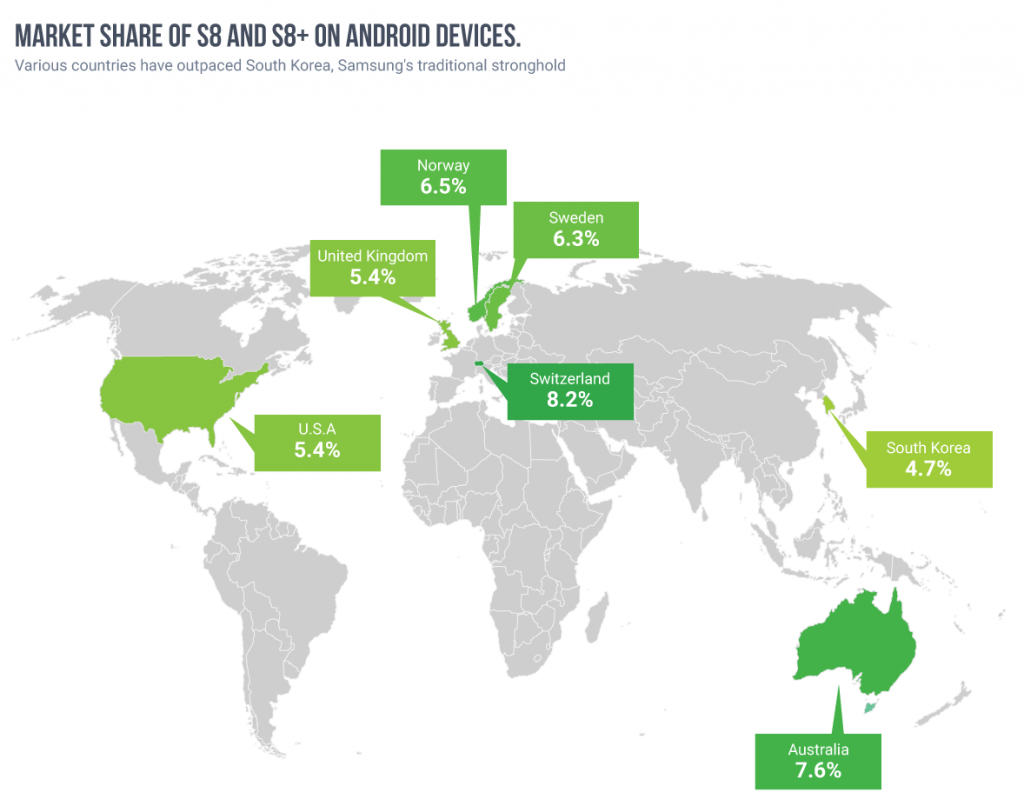 Samsung Galaxy S8 opravdu táhne. Svědčí o tom i průzkum, který se zaměřil na trhy se smartphony po celém světě. Z něj totiž poměrně jasně vyplývá, že je několika evropských zemích zastoupen opravdu výrazně a to dokonce tak moc, že předběhl i samotnou Jižní Koreu.