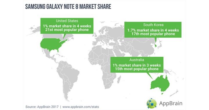 Zákazníky neodradila poměrně vysoká cena ani pověst, která se s řadou Note od minulého roku táhne. V domovské Jižní Koreji trhaly předobjednávky a klasické prodeje rekordy a o mnoho hůře si smartphone nevedl ani v ostatních zemích. Například v USA využívá nový Note8 měsíc po jeho vypuštění jednoho procenta všech uživatelů využívajících Android. To dělá z nového Samsungu 21. nejpopulárnější telefon v zemi, což je s ohledem na jeho cenu a dobu, kterou je na trhu, vcelku heroický výkon. V Austrálii si vedl nový Note8 ještě lépe a jednoho procenta dosáhl už po třech týdnech. V Jižní Koreji je pak Note8 využíván 1,7 % populace.