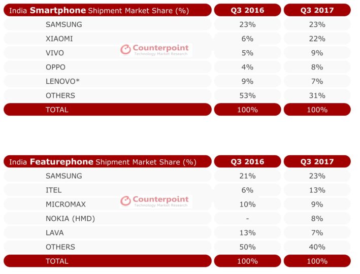 Údaje společnosti Counterpoint ukazují, že si Samsung i nadále drží velký 23% podíl na indickém trhu. Xiaomi mu však se svými 22 % dýchá tvrdě na záda a pravděpodobně odpočítává poslední dny a měsíce do velkého úspěchu v podobě překonání jihokorejského giganta.