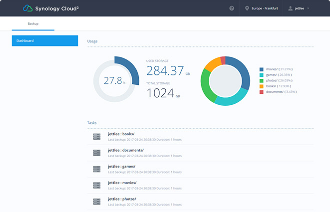 Synology C2 Backup je nyní k dispozici v Evropě. Pro nové uživatele, Synology C2 Backup nabízí 30denní bezplatnou zkušební verzi, díky které mohou vyzkoušet všechny skvělé funkce. Pro poptávku větší kapacity úložiště nás kontaktujte přímo zde. Další informace naleznete na webu Synology C2 Backup na synology.com/c2 Synology C2 Backup je k dispozici na DiskStation, RackStation a FlashStation.