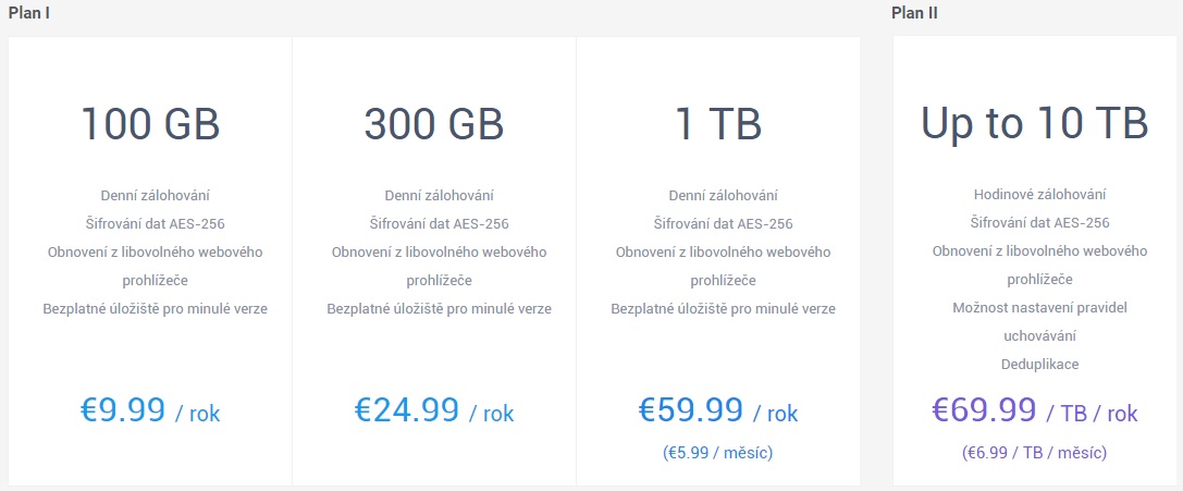 Tak, jak to u většiny cloudových služeb bývá, i C2 Backup má k dispozici několik tarifů. Před výběrem byste si měli vypočítat, kolik dat budete potřebovat na cloud zálohovat a podle toho zvolit tarif. Tarify u Synology se dělí do Plánu I a Plánu II – jaký je mezi nimi rozdíl?