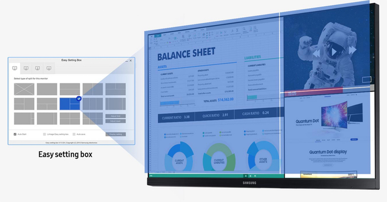Společnost Samsung Electronics dlouhodobě vylepšuje svá zobrazovací zařízení. Proto vyvinula aplikaci Easy Setting Box, která je určena současným i budoucím majitelům jejich Full HD a UHD monitorů. Aplikace umožňuje virtuálně rozdělit plochu na vícero menších částí, do kterých je možné jednodušeji umisťovat jednotlivá okna a programy.