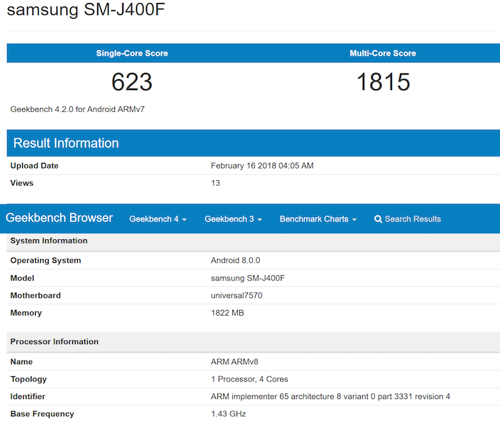 Výsledky testu, které byly zveřejněny v databázi Geekbench, potvrzují příchod telefonu Galaxy J4 s Androidem 8.0, ve kterém poběží čtyřjádrový procesor s taktem 1,4 GHz, kterému budou sekundovat 2 GB RAM paměti. V testu jednoho jádra získal tento model 623 bodů, ve testu více jader se pak vyšvihl na rovných 1815 bodů. Ačkoliv nejsou tyto výsledky ničím zcela oslnivým, pro nenáročné uživatele určitě bohatě postačí.