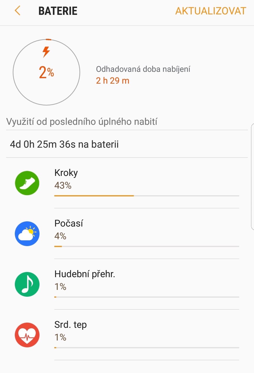 Gear Fit2 Pro na tom po stránce výdrže není špatně ani nijak světoborně – zkrátka průměrně. Během testování mi baterie vydržela na jedno nabití vždy 4 dny, a to jsem si náramkem poměrně často hrál, nadprůměrně často synchronizoval naměřená data s telefonem a celkově zkoumal všechny jeho funkce, což se jistě odrazilo na vytížení baterie. Jas displeje jsem měl po celou dobu nastavený na polovinu. Výdrž je tedy poměrně dostačující. Samozřejmě existují náramky s podobnými funkcemi, které vydrží výrazně více, na druhém břehu řeky ale naopak stojí trackery, které nabízí jen 2-3 denní výdrž . Ačkoli se tedy Fit2 Pro řadí výdrží k průměru, nabít jej jednou za 4 dny není podle mého názoru nijak omezující.
