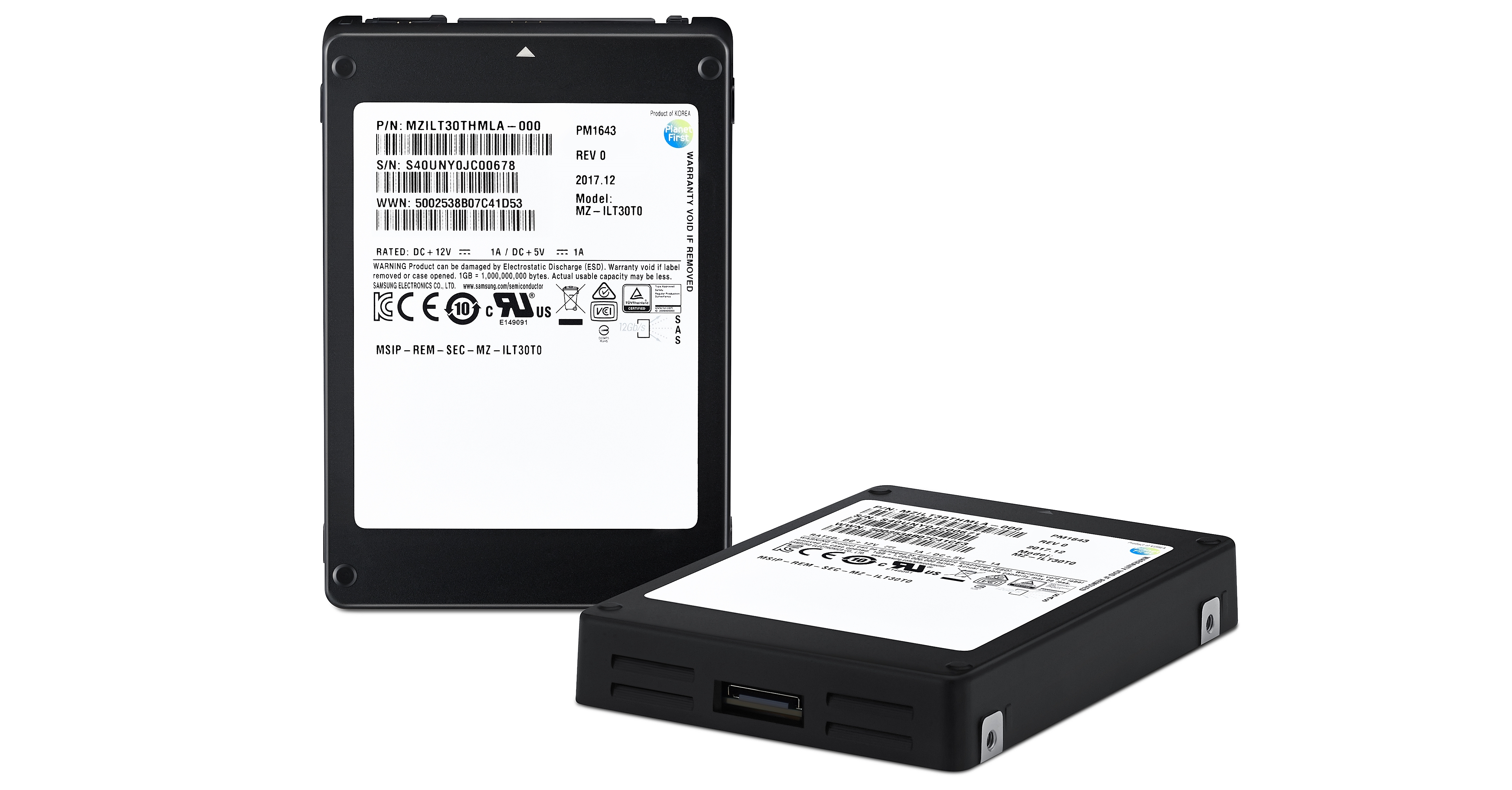 Samsung PM1643 je vyroben z 32 kusů 1TB flash NAND flashů, z nichž každý obsahuje 16 vrstev 512Gb V-NAND čipů. To je dostatek místa k uložení asi 5700 filmů ve FullHD rozlišení nebo zhruba 500 dní nepřetržitého záznamu videa. Nabízí také impozantní sekvenční čtení a zápis rychlostí až 2100 MB/s a 1 700 MB/s. To je hodnota přibližně třikrát vyšší, než jaké rychlosti dosahují průměrné SDD určené pro obyčejné spotřebitele.