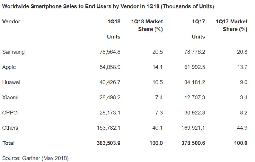 Podle analytické společnosti Gartner zaznamenal celosvětový trh se smartphony v období Q4 2017 mírný meziroční pokles o 6,3 %. Zdá se však, že za období Q1 2018 se počet prodaných smartphonů zvýšil, protože došlo k meziročnímu nárůstu o 1,3 %, přičemž celkově se prodalo 383,5 milionů kusů telefonů.