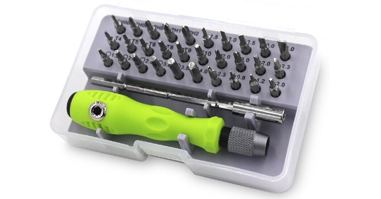 Multifunkční šroubovák 32v1 vychází v přepočtu jen na 97 Kč a nabízí celou sadů bitů pro rozebrání nejrůznějších věcí, ať už jde o telefon, tablet, notebook. Bitů (nástavců) je rovných 30 a snadno je kdykoli nasadíte na šroubovák pro použití. Na výběr je několik velikostí klasických křížových i plochých šroubováků a nechybí ani několik rozměrů Torx a další specifické bity. Součástí balení je také 10cm prodlužovací nástavec, díky kterému se dostanete i k hůře přístupnému šroubku. Celá sada v plastové krabičce 12 x 7,5 cm, kde jsou bity úhledně seskládané podle tipu s popiskami.