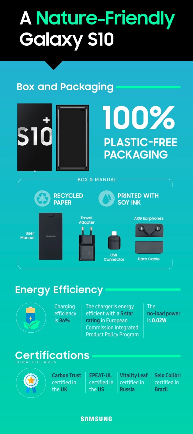 Jak na krabičku, tak i na manuál použil Samsung recyklovaný papír a sojový inkoust. Vstřícným krokem vůči životnímu prostředí je také matný finiš nabíječky, který nevyžaduje ochranný plastový film. Výsledkem všech těchto kroků je ekologicky udržitelné balení zcela bez plastů. Podobný styl balení Samsung použil i pro své letošní modely řady Galaxy M a Galaxy A.