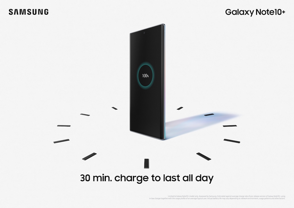 - Superrychlé nabíjení: Po 30minutovém nabíjení kabelem s výkonem až 45 W vydrží Galaxy Note10+ celý den.