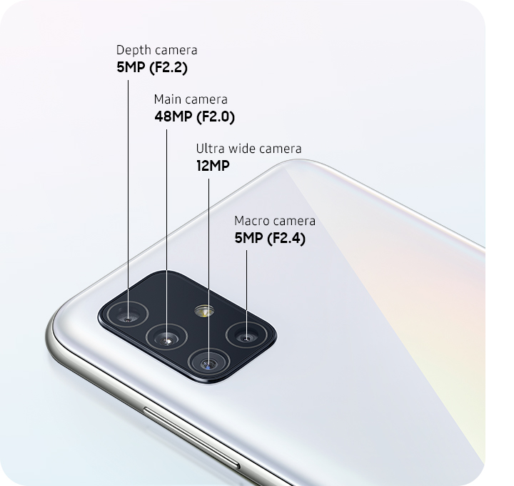 Galaxy A71 a Galaxy A51 disponují fotoaparátem se čtyřmi objektivy. Kromě hlavního fotoaparátu zde najdeme ještě ultraširokoúhlý objektiv, makro a fotoaparát se selektivní hloubkou ostrosti. Hlavní fotoaparát se v případě modelu Galaxy A71 pyšní úctyhodným rozlišením 64 Mpx, v případě Galaxy A51 se jedná o snímač s rozlišením 48 Mpx. Díky ostrým a živým snímkům umožní fotoaparát pořizovat nejlepší možné fotografie bez ohledu na denní či noční dobu. Ultraširokoúhlý fotoaparát je vybaven objektivem se zorným úhlem 123°, což odpovídá perifernímu vidění lidského oka. Pokud to záběr vyžaduje, inteligentní funkce doporučí širokoúhlý režim a automaticky na něj přepne. Makroobjektiv dokonale zaostřuje předměty a dokáže tak v ostrém obraze zachytit prakticky každý detail, zatímco objektiv se selektivní hloubkou ostrosti dává fotografovaným objektům vyniknout pomocí efektů živého ostření.