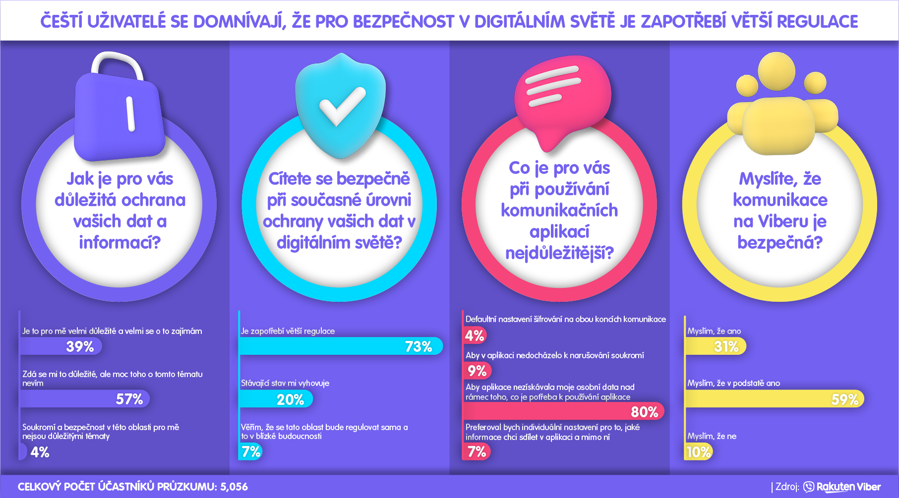 Tisková zpráva: Rakuten Viber, přední komunikační platforma v regionu střední a východní Evropy, uspořádala u příležitosti mezinárodního Dne ochrany osobních údajů průzkum mezi více než čtyřmi miliony svých uživatelů v devíti zemích. Hlavním tématem průzkumu byla důležitost ochrany osobních údajů v digitální komunikaci. Anketa byla provedena v oficiálních komunitách Rakuten Viber v České republice, na Slovensku, v Maďarsku, Chorvatsku, Srbsku, Slovinsku a Řecku a jejím cílem bylo zjistit, co je pro uživatele v digitálním prostředí důležité. Anketa zajistila okamžitou reakci uživatelů a názor více než 170 000 osob. V České republice se zúčastnilo více než 5 000 uživatelů platformy Rakuten Viber.