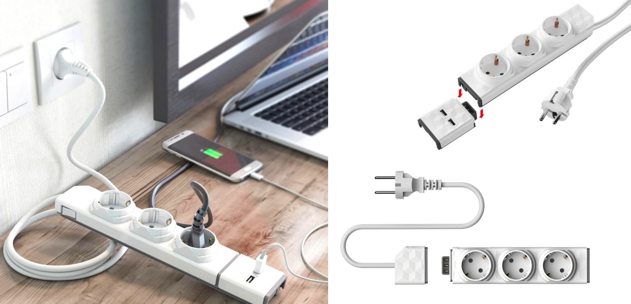 Základním kamenem téhle praktické stavebnice je PowerStrip, u kterého máte na výběr ze tří druhů, lišících se délkou prodlužovacího kabelu a tlačítkem pro vypnutí/zapnutí. PowerStrip je připojen do zásuvky a připraven pojmout dílčí moduly. Druhou variantou je pořídit si Power Modul Cable, tedy samostatný kabel, rovněž navržen pro zacvaknutí kteréhokoli modulu.