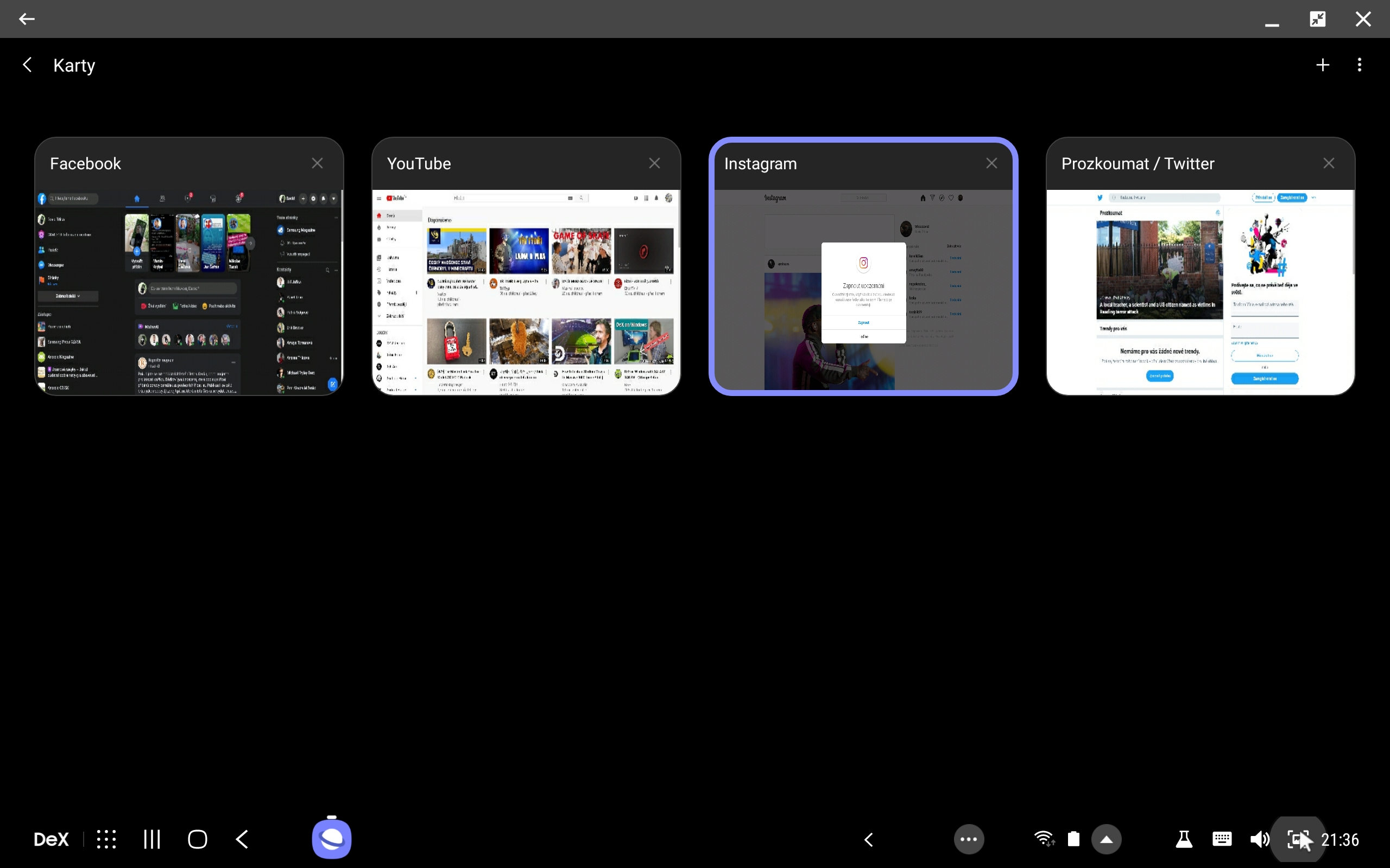 Bohužel i když využijete náš první tip, tak ne všechny aplikace fungují v DeX režimu dobře. Obzvlášť se to týká sociálních sítí, které jsou leckdy podivně roztažené, v případě Facebooku máte navíc zvlášť aplikaci pro chatování a zvlášť pro sociální sít. Instagram funguje obecně na tabletech špatně. Naštěstí je tu poměrně jednoduché řešení. A to využívat webové verze, podobně jako kdybyste byli na PC. Většina Android prohlížečů navíc podporuje zobrazení stránek jako na PC, což se u DeX hodí. Z osobní zkušenosti doporučujeme přímo Samsung prohlížeč, který je nejlépe vyladěn na práci se Samsung DeX. Velice dobře ale funguje i třeba Google Chrome.