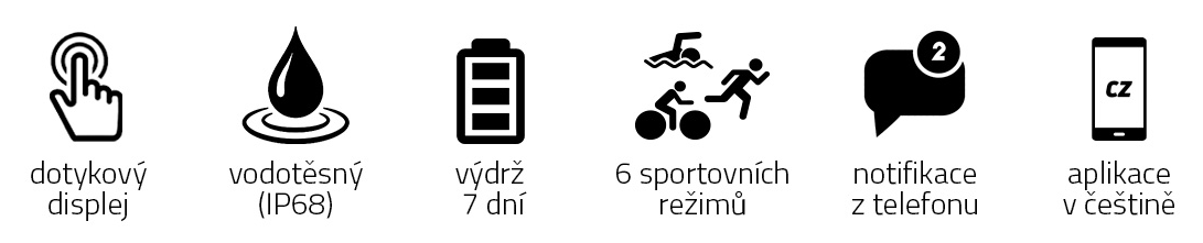 - 6 sportovních režimů (chůze, běh, turistika, plavání, cyklistika a basketbal)