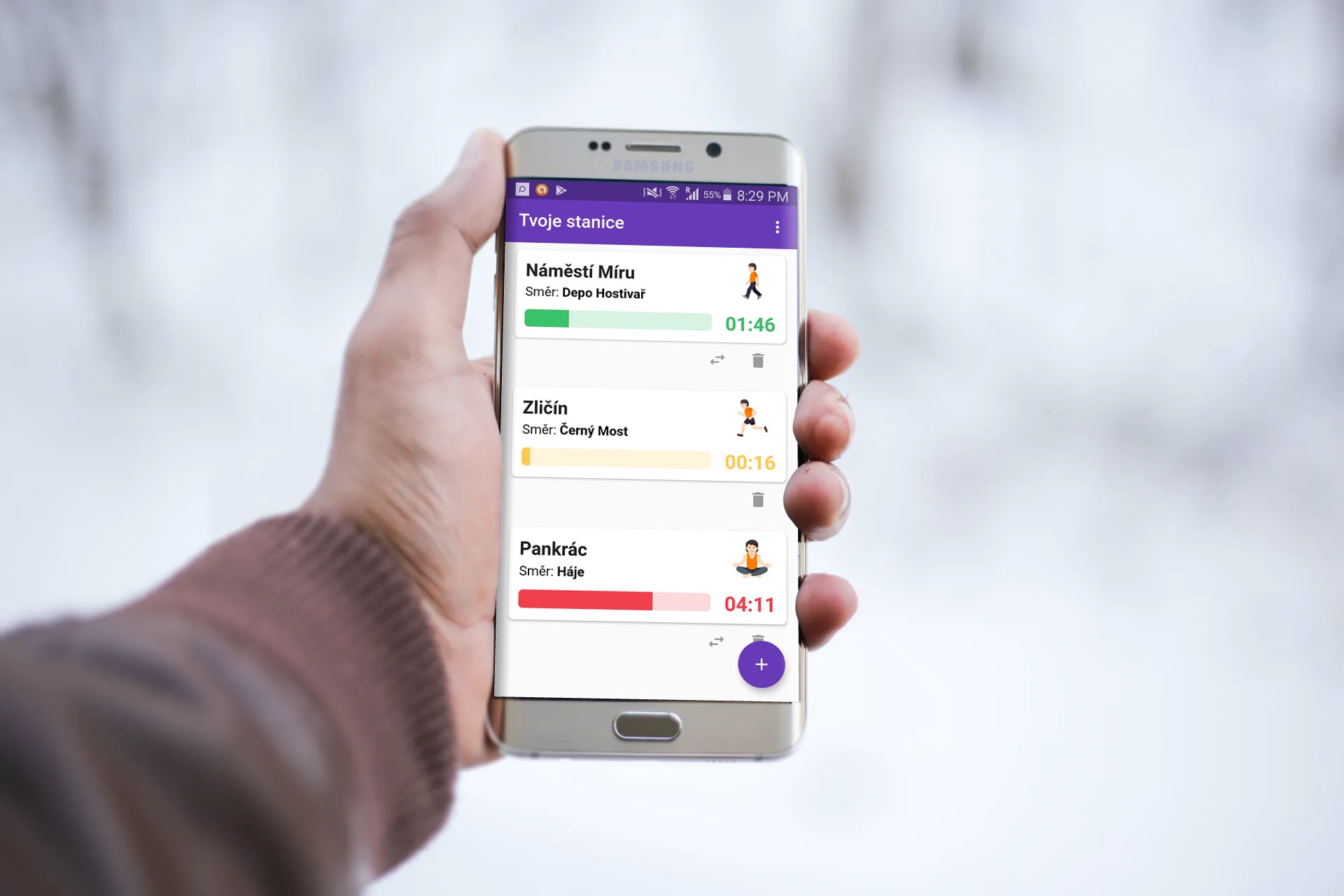 Pojďme se tedy podívat na funkčnost aplikace v praxi. Na hlavní stránce před sebou máme své stanice, jež jsme si předem nastavili, a vidíme u nich blikající odpočet s emotikonami. Zmiňovaný odpočet přesně zobrazuje, za kolik sekund, popřípadě minut, odjíždí náš spoj. Poměrně elegantní řešení zde představuje samotný smajlík. Ten totiž vyjadřuje, zdali metro od turniketů vůbec dokážeme stihnout. Nejprve můžeme vidět meditujícího panáčku, což značí, že máme ještě spoustu času. V určitém okamžiku se ale přepne na chodce, kdy bychom už měli vyjít. Jakmile se objeví běžící muž, musíme přidat a pokud se už u turniketů zobrazí panáček s překříženýma rukama, můžeme se rovnou zastavit – metro už totiž nemáme šanci stihnout.
