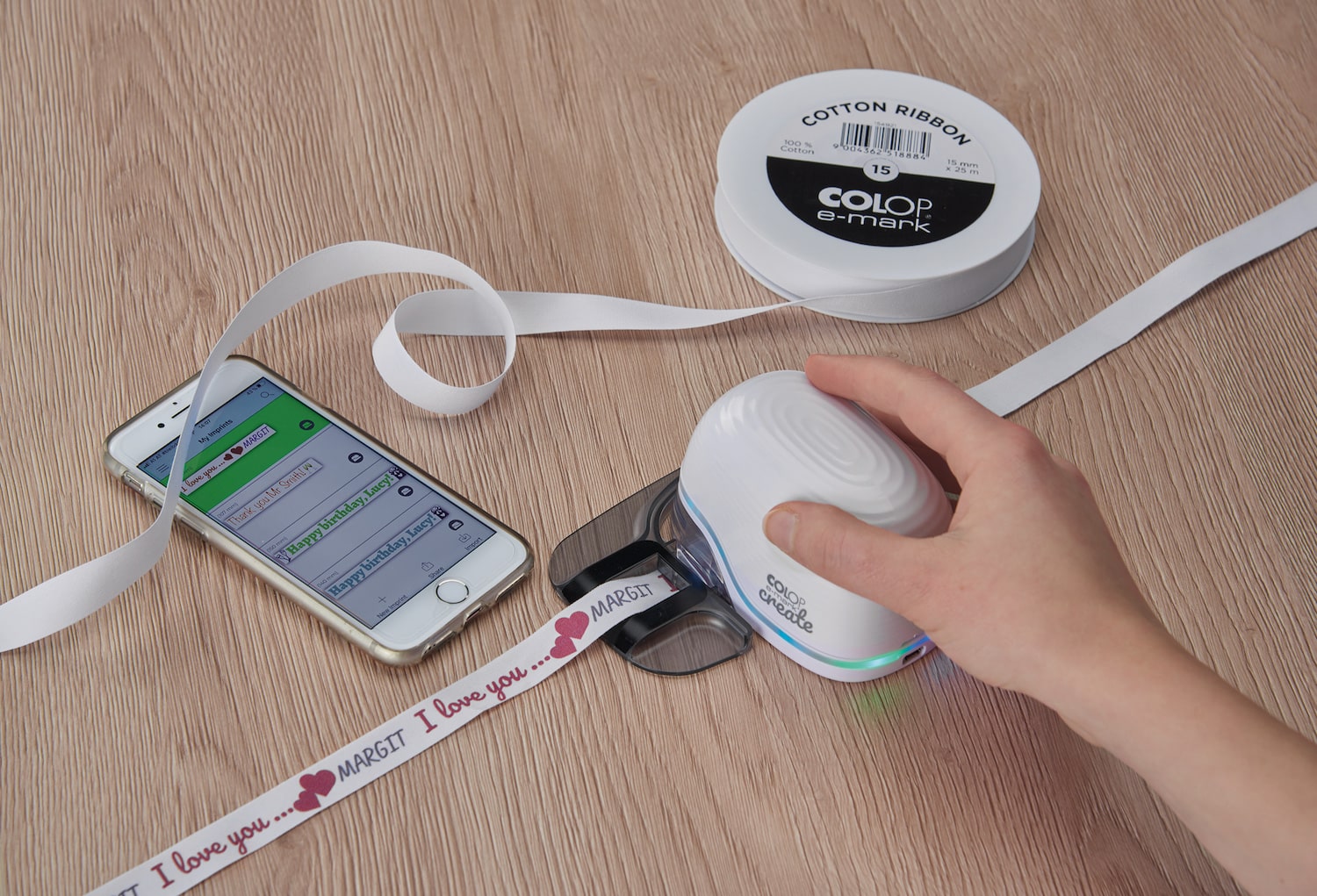 S pomocí COLOP e-mark create můžete vytvářet nejrůznější barevné otisky pouhým klepnutím prstu. Váš vlastní design tak můžete nanést na jakýkoliv povrch a například tak ozdobit stuhy, restaurační menu, cedulky, a dokonce i trička. Produkt se poté pyšní technologií Wi-Fi pro propojení iPhonu s tiskárnou a pro přenos návrhů.