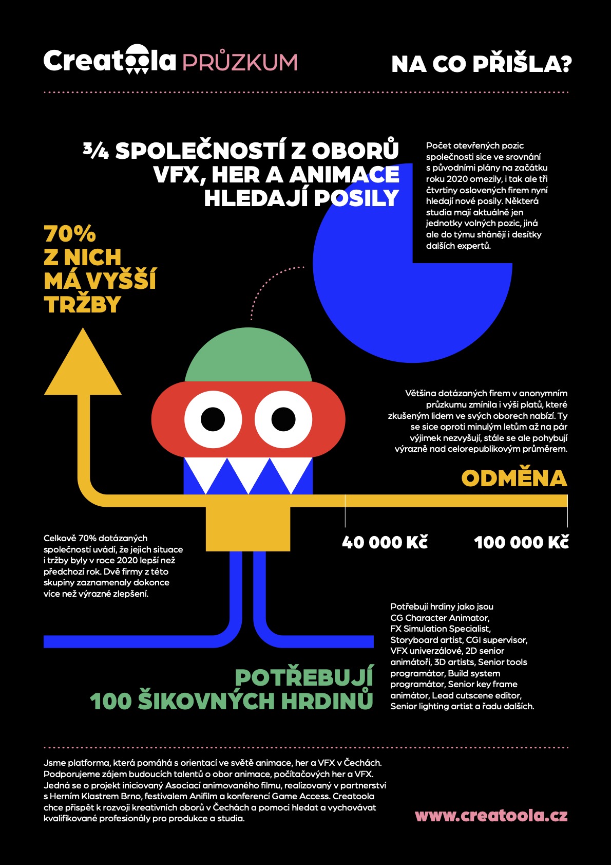 Tisková zpráva: Náročným rokem 2020 prošla většina českých firem, které se zabývají vývojem počítačových her a animací, velmi dobře. Pro více než dvě třetiny z nich bylo uplynulých dvanáct měsíců lepších než rok 2019. Zaznamenaly větší zájem o své produkty a měly i vyšší tržby. Optimisticky vidí i budoucnost svých odvětví a hledají další posily. Vyplývá to z průzkumu platformy Creatoola, která pomáhá tato odvětví propojovat navzájem a také s dalšími lidmi a institucemi. Průzkumu se v závěru roku 2020 zúčastnilo 19 předních českých firem z oboru animace a počítačových her.