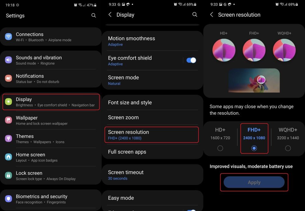 Další možností, jak na Galaxy S21 Ultra prodloužit výdrž baterie, je snížit rozlišení z WQHD+ (1440 x 3200 px) na FHD+ (1080 x 2400 px). Snížení rozlišení samo o sobě nebude mít na výdrž zásadní vliv; větší přínos však bude mít v kombinaci se standardní obnovovací frekvencí. Rozlišení displeje snížíte takto: