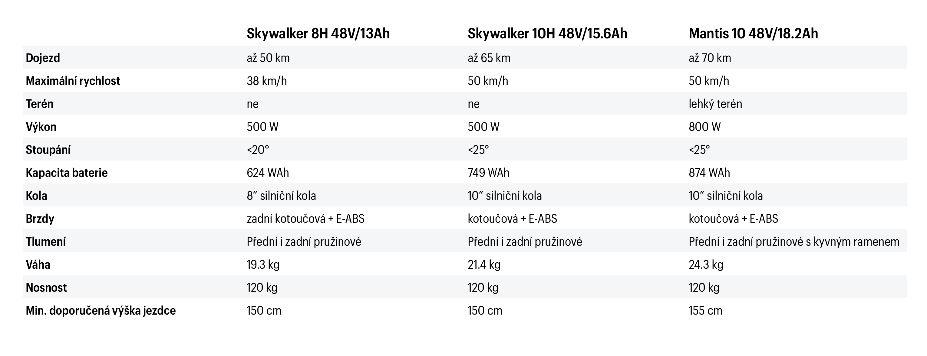 Zbylé dva dostupné modely jsou z řady KAABO Skywalker a jsou přímo ideální do města. Koloběžky se prakticky liší jen hlavními parametry a nepatrně i konstrukcí. Levnější Skywalker 8H za 19 990 Kč nabízí dojezd až 50 km a maximální rychlost 38 km/h. Výkonnější Skywalker 10H za 24 990 Kč zvládne na jedno nabití až 65 km a můžete s ní jet až 50 km/h.