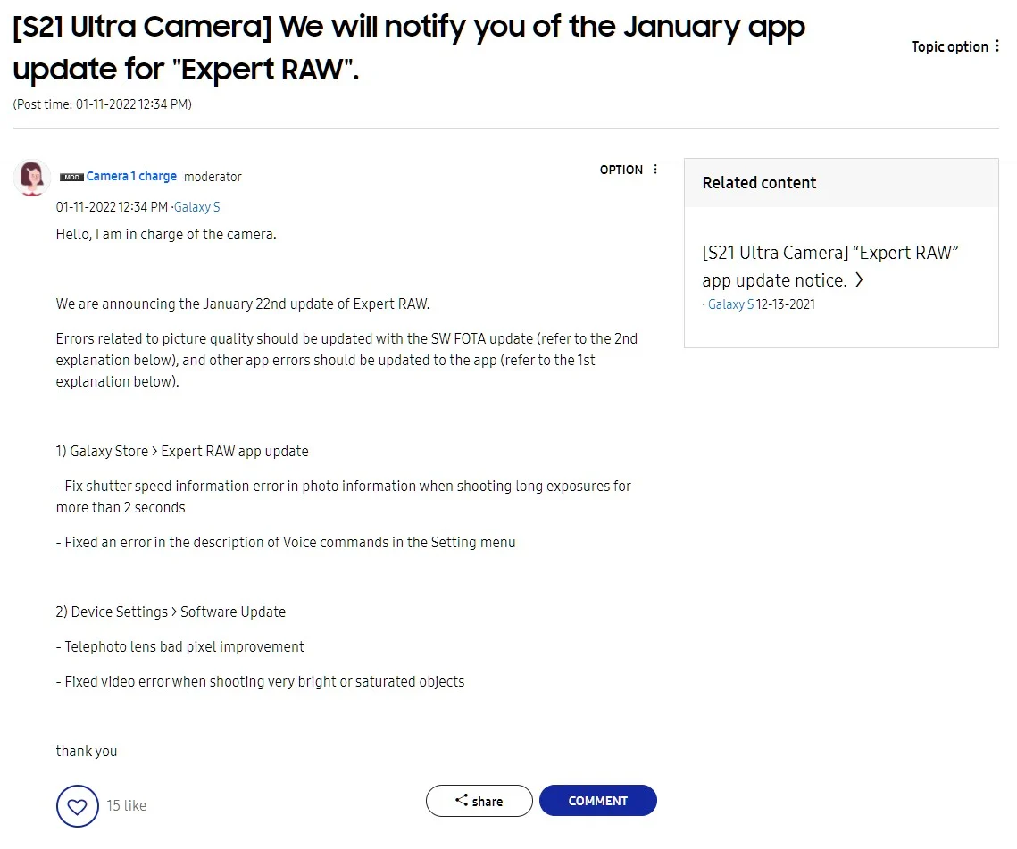 Moderátor fóra Samsung Members oznámil, že nová verze aplikace Expert RAW bude vydána 22. ledna 2022. Aplikaci bude možné aktualizovat prostřednictvím obchodu Galaxy Store a přinese opravy chyb a zlepšení výkonu. Zejména bude opravena známá chyba informace o rychlosti závěrky při pořizování snímků s dlouhým expozičním časem.