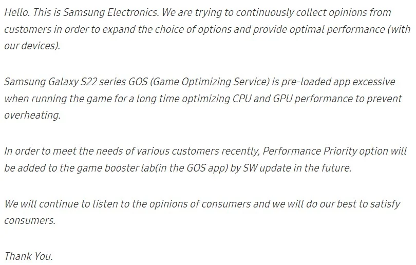 Jak se dalo předpokládat, Samsung v něm tvrdí, že důvodem omezování je zabránit přehřívání zařízení při dlouhodobém jeho používání aplikací nebo her. Společnost však již připravuje řešení, které dá uživateli možnost toto omezení vypnout, a které přijde s aktualizací softwaru. Bude se jednat o tlačítko, které umožní přinutit systém GOS (prostřednictvím aplikace Game Booster, která je v zařízeních Galaxy předinstalována), aby upřednostnil právě výkon před vším ostatním (tedy i výdrží baterie).