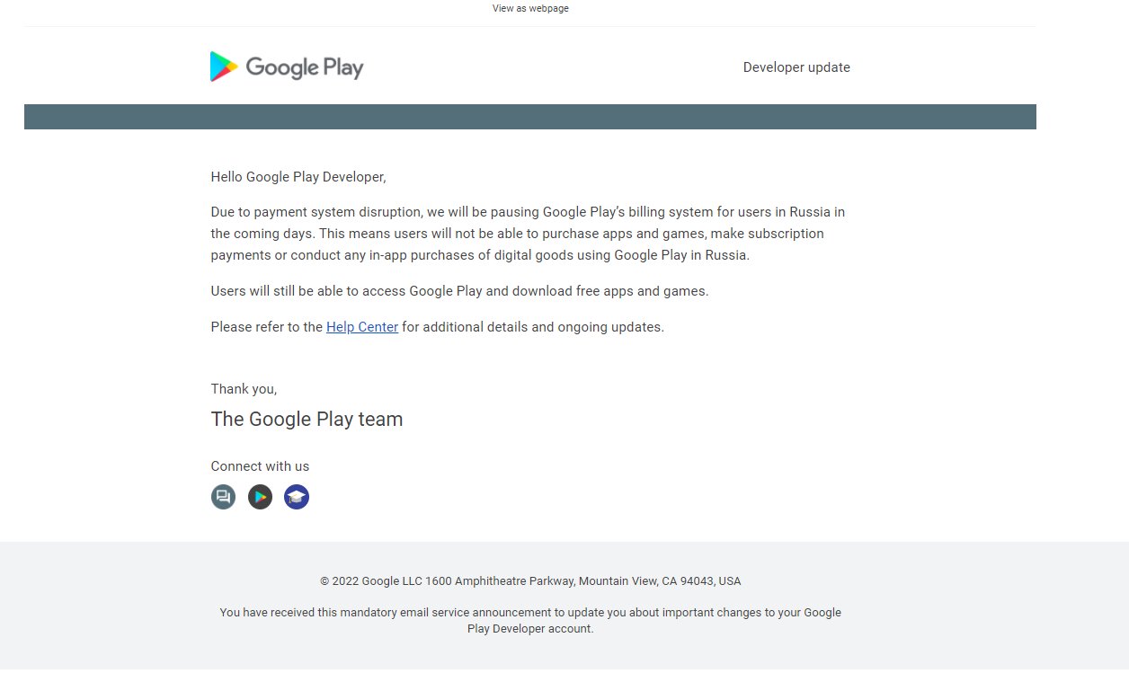 Jak uvedl ve svém účtu v sociální síti Twitter Mishaal Rahman, společnost Google oznámila vývojářům, že tato omezení budou zavedena „v nejbližších dnech“. Společnost uvádí, že je to kvůli „narušení platebního systému“, což pravděpodobně odkazuje na sankce ve finančním sektoru ze strany americké vlády (mimo jiné), které byly na Rusko uvaleny v minulých dnech. Dalším faktorem, který ztěžuje zpracovávání plateb pro mezinárodní společnosti, je pravděpodobně pozastavení činnosti společností Visa a Mastercard v Rusku.
