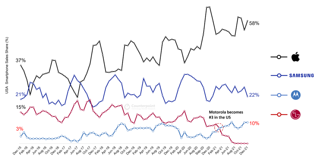 Americký trh s chytrými telefony není stejný jako ten v jiných regionech světa. Zatímco v Evropě a Asii se čínským značkám Xiaomi, Oppo a Realme daří, v USA se příliš neprosazují. Jednoznačným lídrem je domácí Apple, s velkým odstupem následuje Samsung, který se jej sice snaží dohnat, ale jednoduše nestíhá. Zatímco se pak první dvě pozice zdají být letitými stálicemi, začala zde vystrkovat růžky i znovuzrozená Motorola.
