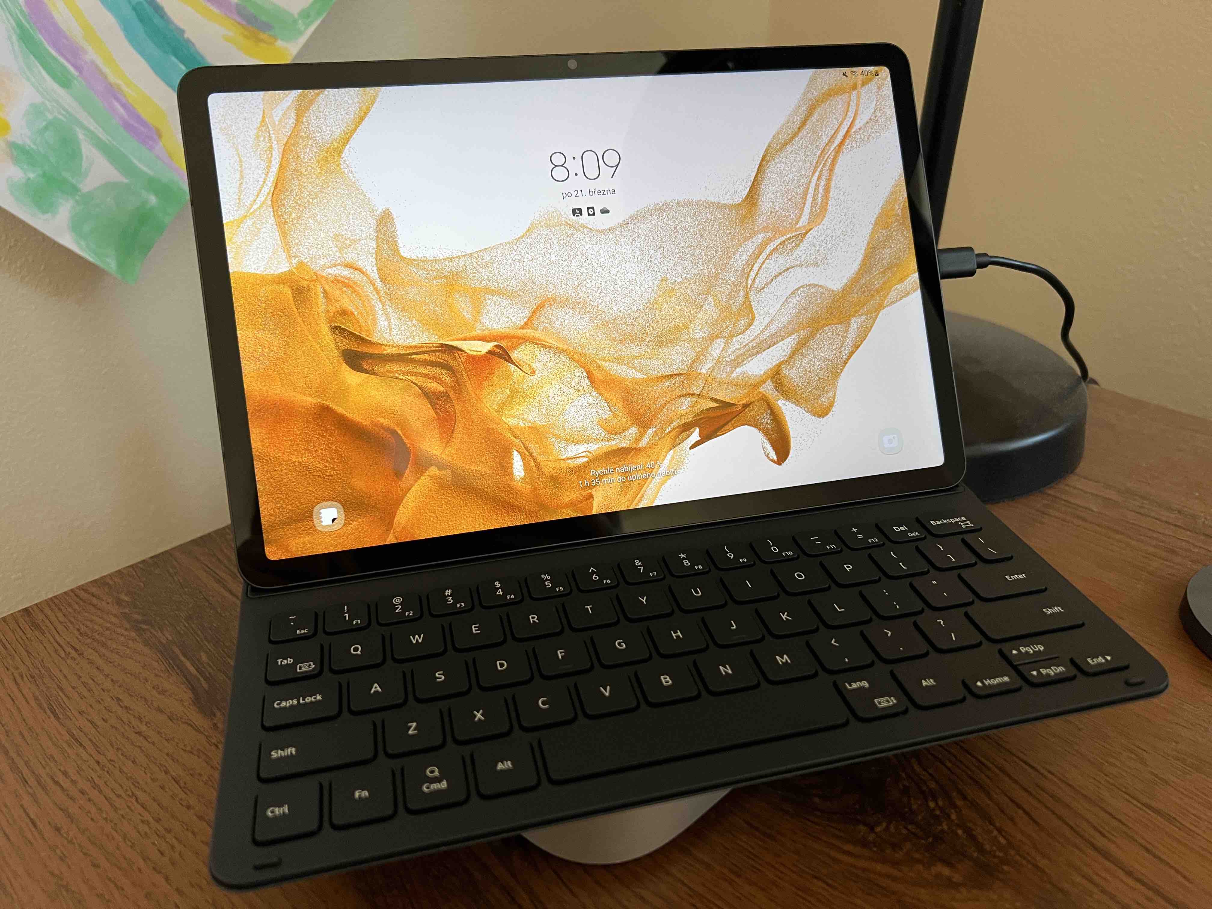 Máte-li ale Book Cover Keyboard, můžete si při přenášení tabletu stylus schovat do jeho hřbetu, kde je pro něho vyhrazené místo. Nebude se zde sice nabíjet, ale zase se vám od tabletu neodpojí, ať už jej nosíte v batohu, brašně, nebo kdekoli jinde. Klávesnice samozřejmě chrání i celý tablet, ke kterému se přichytí také magneticky. Klávesnice byla k dispozici zdarma k tabletu v rámci jeho předobjednávek, jinak stojí 3 690 Kč a je shodná s tou pro Galaxy Tab S7. Znamená to, že zde nenajdete ani českou diakritiku a řazení je QWERTY, nikoli QWERTZ. I z toho důvodu nepíši tuto recenzi přímo na ní, protože je to zbytečně omezující. Protože pak nabízí jen jednu polohu, je sice fajn ji mít, když ji dostanete zdarma, určitě bych za ní ale neutrácel – pokud pro ni nemáte jasné využití. Váha klávesnice je poměrně vysokých 274 g.