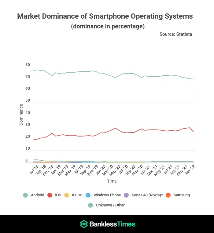Ztráta podílu Androidu na trhu se odvíjí od zvýšené konkurence v oblasti operačních systémů. Pohled na data ukazuje, že iOS získal mezi červencem 2018 a lednem 2022 6 % podílu, kdy jej z tehdejších 19,4 % zvýšil na 25,49 %. Na ostatní malé OS připadá zbývajících 1,58 %, o které také Google přišel. I tak má Android díky open-source a cenové dostupnosti přízeň mas po celém světě. Google si tím vybudoval nedostižný náskok a bude potřeba dokázat něco mimořádného, aby ho Apple a ostatní překonali.