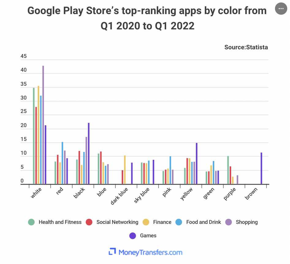 Jak uvádí generální ředitel MoneyTransfers Jonathan Merry, ikony nejoblíbenějších aplikací využívaly bílou barvu na přibližně 43 % své plochy. Je ale pravda, že hodně záleží na žánru. Černá totiž dominuje hrám, červená naopak aplikacím pro jídlo a pití, sociální sítě pak musí mít ideálně modrou barvu (kterou má třeba Facebook nebo Twitter).