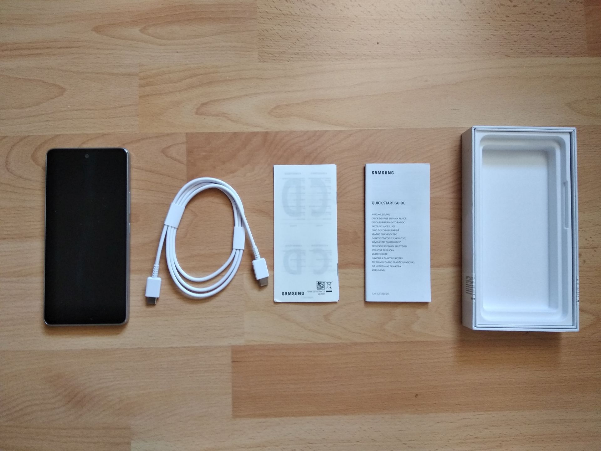 Telefon k nám přišel v poměrně tenké bílé krabičce, ve které se kromě něj nacházel už jen nabíjecí/datový USB-C kabel, jehla na vytažení šuplíku na SIM kartu (přesněji řečeno na dvě SIM karty nebo jednu SIM kartu a paměťovou kartu) a uživatelské příručky. Ano, Samsung pokračuje v pro nás nepříliš pochopitelném „ekotrendu“ a do balení nepřidává nabíječku. Balení je skutečně minimalistické a nenajdete v něm nic navíc. Skoro se nám chce napsat, že tak dobrý telefon si takové chudé balení nezaslouží.