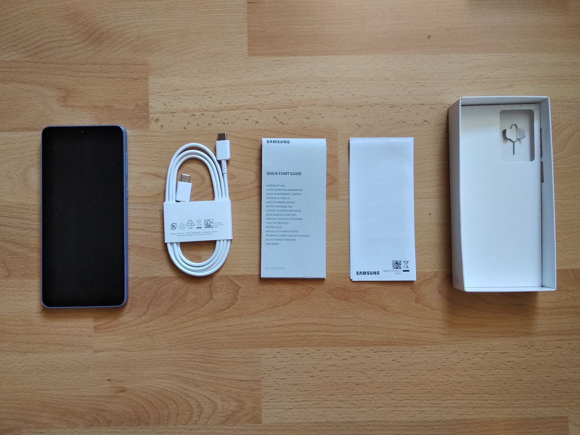 Pokud jste si mysleli, že obsah balení Galaxy A33 5G je jiný než u Galaxy A53 5G, musíme vás zklamat. Najdete zde úplně to samé, tj. nabíjecí/datový kabel s USB-C koncovkami, jehlu na vytažení šuplíku na SIM kartu, resp. na dvě SIM karty či jednu SIM kartu a paměťovou kartu, a pár uživatelských příruček. Je určitě škoda, že takový smartphonový gigant, jako je Samsung, nabízí u svých telefonů tak chudé balení. Nabíječka je podle nás jeho základní součástí alespoň s ohledem na střední třídu, když už ne tu nejvyšší.