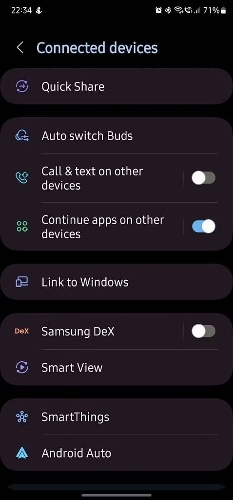Nová nabídka s připojenými zařízeními vám umožní ovládat veškerá zařízení připojená k vašemu telefonu z jednoho místa. Poskytne vám přístup k funkcím, které fungují i na ostatních zařízeních, jako Je Quick Share, Smart View a DeX. Součástí menu je položka Auto switch Buds, která vám umožní automaticky přepínat připojená sluchátka z jednoho zařízení na druhé.