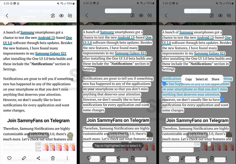 Další významnou novinkou, kterou byste měli vyzkoušet mezi prvními, je funkce Extract text (vyjmutí textu). Funkce umožňuje kopírovat text prostřednictvím internetu, aplikací Samsung Keyboard a Galerie nebo kdykoli típnete screenshot a následně jej vložit do zprávy, e-mailu nebo dokumentu, místo abyste jej napsali.