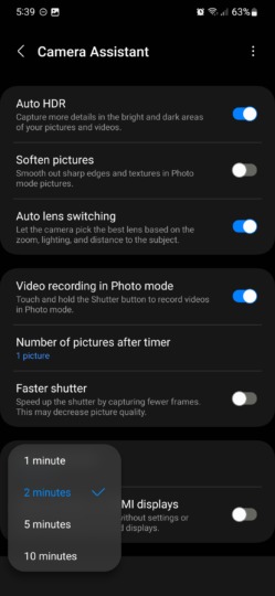 Tato rozbalovací nabídka vám umožňuje nastavit si dobu, po kterou zůstane aplikace fotoaparátu otevřená, když není aktivní. Ve výchozím nastavení se fotoaparát vypne po dvou minutách nečinnosti, klepnutí na tuto nabídku vám však umožní vybrat si mezi jednou, dvěma, pěti a deseti minutami.
