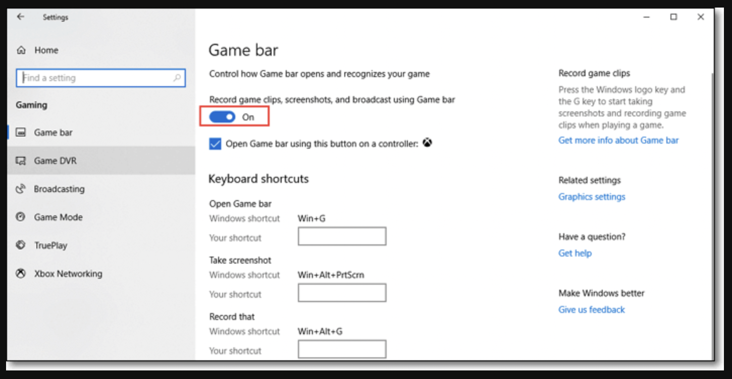 Vlastně vám stačí jen stisknout ikonu Windows na své klávesnici a na obrazovce zvolit Nastavení -> Hry. Poté, co se zobrazí okno herního panelu, zapněte tlačítko Nahrávání. Dále už si nastavte klávesové zkratky podle svých potřeb. Po dokončení nastavení otevřete hru a zachyťte obrazovku stisknutím kláves Win + Alt + R.