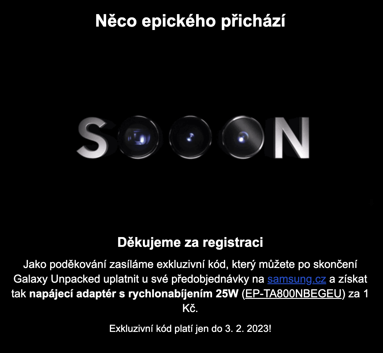 Všem, kteří se na stránkách Samsung.cz registrovali k odběru novinek týkajících se řady Galaxy S23 začala společnost nyní rozesílat e-mail, ve kterém dostanou speciální kód. Po skončení Galaxy Unpacked jej poté můžete uplatnit u své předobjednávky a díky tomu získat napájecí adaptér s rychlonabíjením 25W (EP-TA800NBEGEU) za 1 Kč. plná cena nabíječky je přitom 390 Kč. Není to příliš velký dárek, ale je rozhodně milý, protože balení nových smartphonů společnosti samozřejmě žádný napájecí adaptér obsahovat nebude.