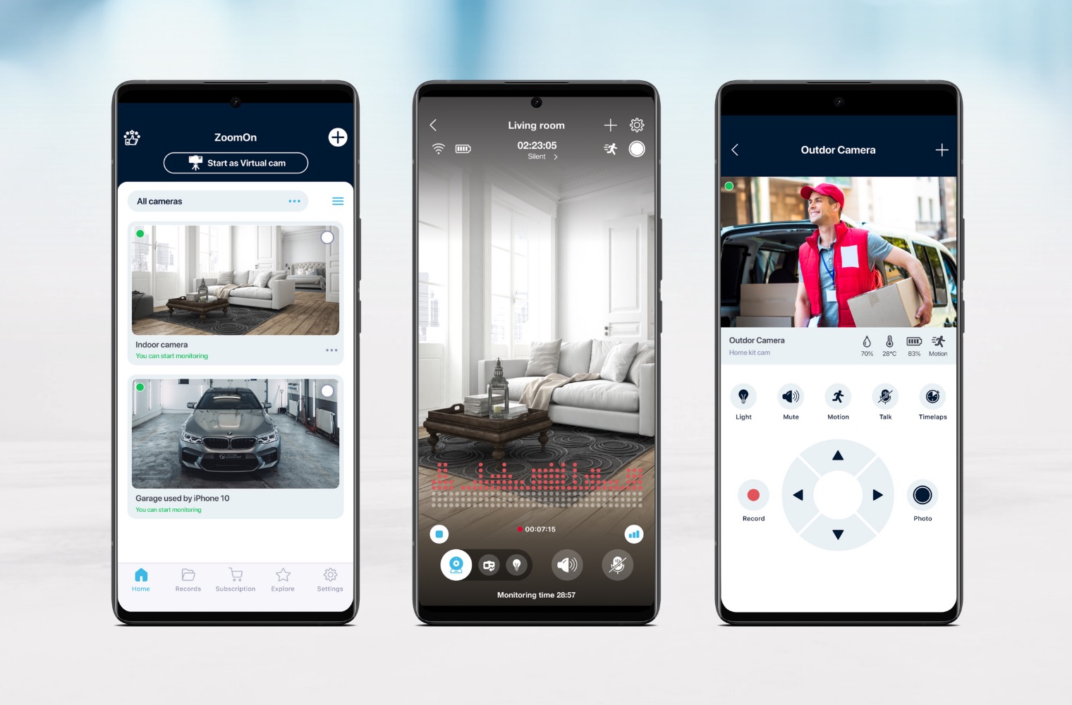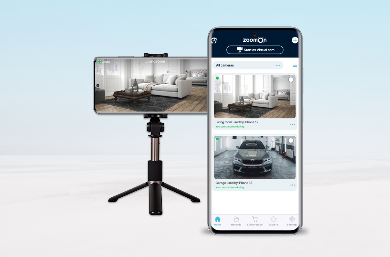 Princip tvorby kamerového systému prostřednictvím aplikace ZoomOn je jednoduchý. Na dva telefony si nainstalujete aplikaci ZoomOn. Následně telefony přímo v aplikaci spárujete (vygenerovaným QR kódem nebo pěticiferným kódem), čímž vznikne jednoduchý kamerový systém. Jeden telefon poslouží jako kamera a druhý jako monitor, který budete mít u sebe. Pak už stačí jen kamerovou jednotku umístit na vhodné místo a zahájit monitorování.