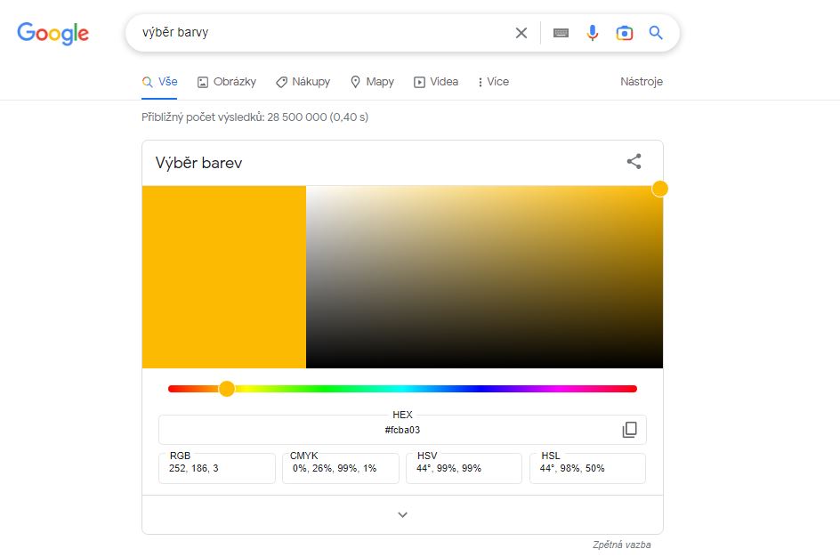 Tato funkce přijde vhod především grafikům, designérům či webdesignérům. Po zadání dotazu výběr barvy se vám zobrazí miniaplikace, která vám umožní si namíchat barvu podle svého. Můžete si ji namíchat pomocí palety nebo zadáním hodnot u barevných modelů HEX, RGB, CMYL, HSV a HSL.