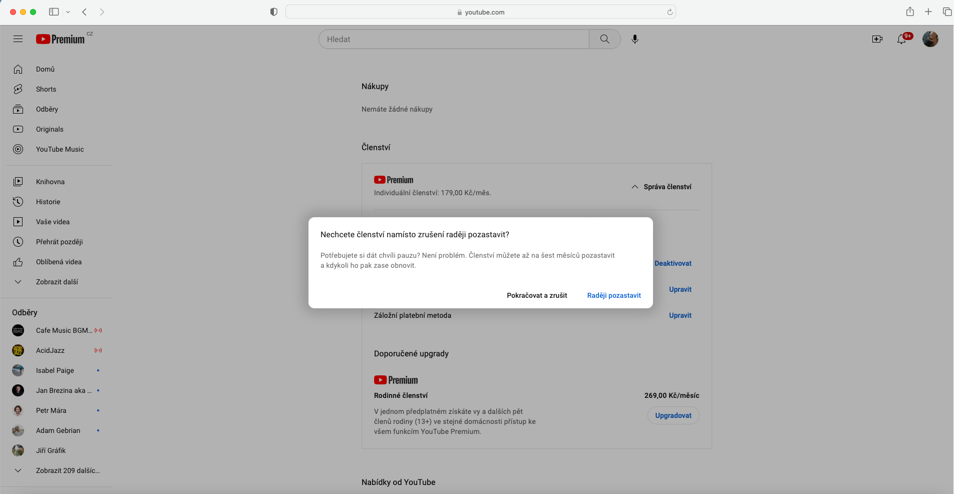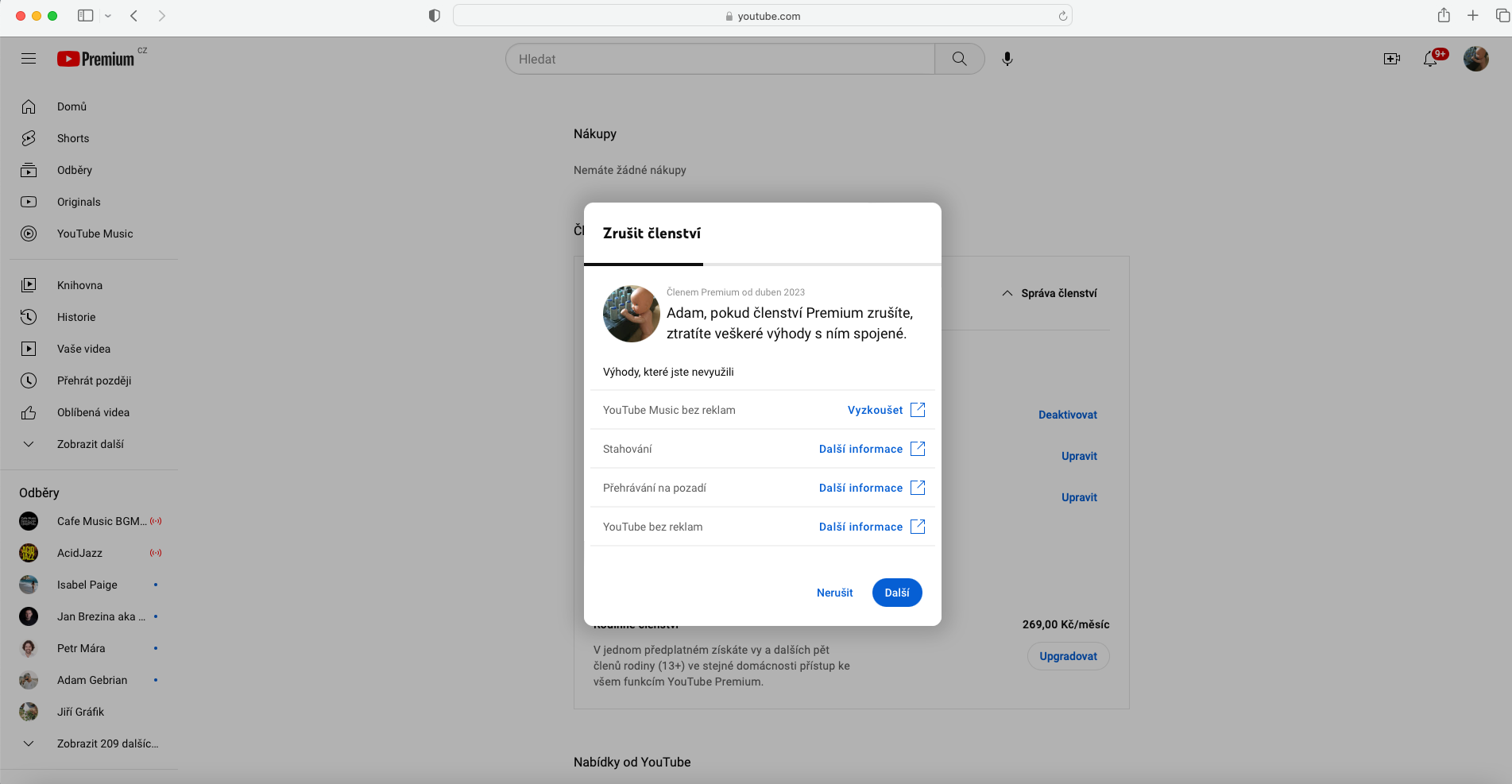 Vyberete-li možnost Pokračovat a zrušit objeví se již zmíněné nevýhody spojené s ukončením předplatného jako je YouTube a YouTube Music bez reklam, možnost stahování nebo přehrávání na pozadí.