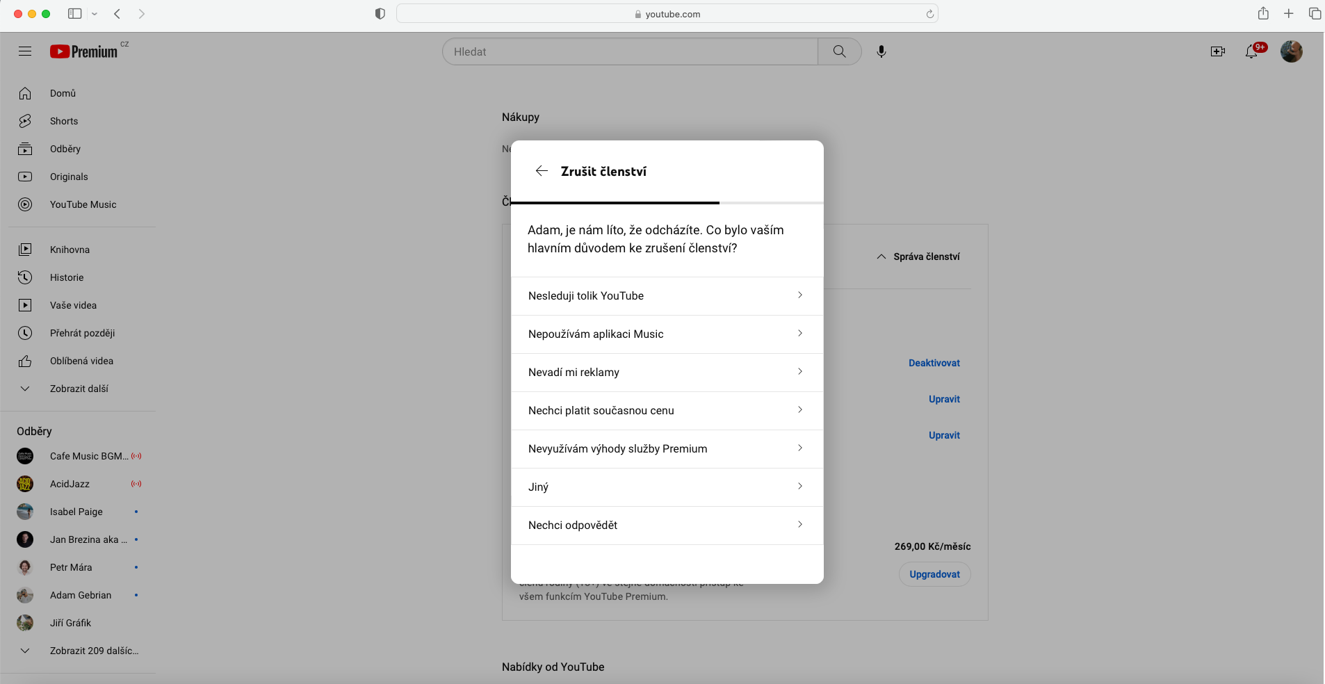 Po kliknutí na tlačítko Další se vás YouTube zeptá na důvod odchodu. Zde je 7 možností jak odpovědět, jako například Nesleduji tolik YouTube, Nevadí mi reklamy, Nechci platit současnou cenu nebo Nechci odpovědět.