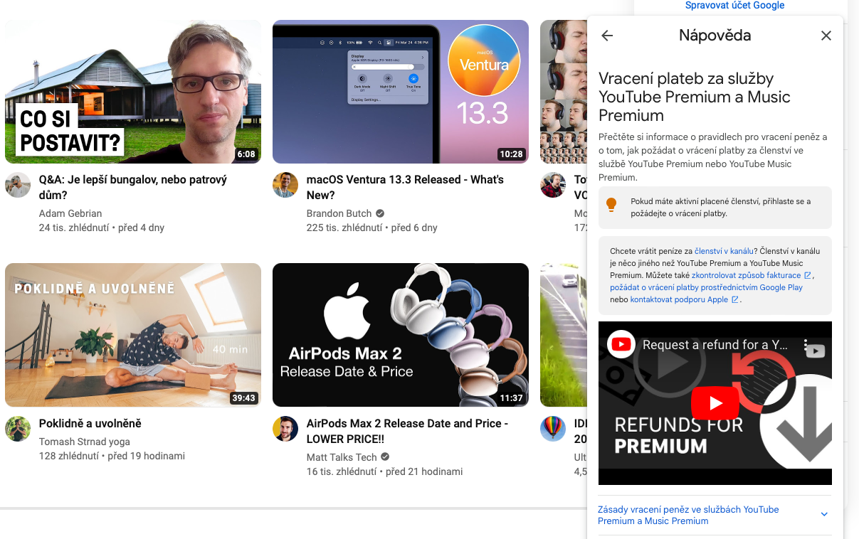 Zároveň stojí za to upozornit na skutečnost, že pokud vaše předplatné služby YouTube Premium nefungovalo podle očekávání, tedy se ve videích YouTube stále zobrazovaly reklamy, můžete mít nárok na vrácení peněz. O to lze požádat na stránce podpory Nápověda. V případě úspěchu vám bude platba vrácena stejnou platební metodou, kterou jste využili k nákupu.