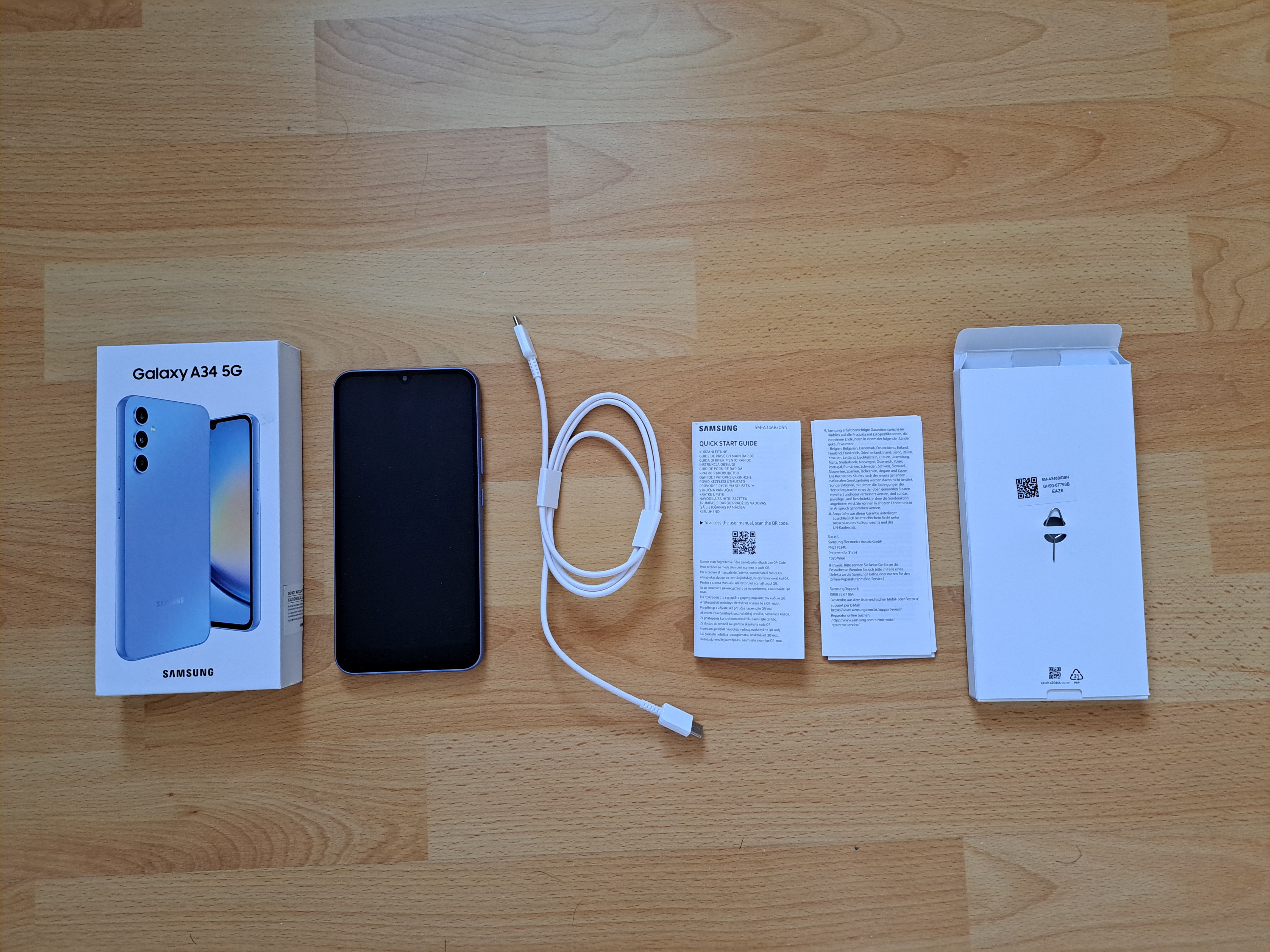 Galaxy A34 5G se stejně jako Galaxy A54 5G dodává v tenké krabičce, ve které najdete jen to nejnutnější. Tedy kromě telefonu samého asi metrový nabíjecí/datový kabel s USB koncovkami na obou stranách, několik uživatelských příruček a jehlu na vysunutí slotu pro SIM kartu (přesněji řečeno pro dvě SIM karty nebo jednu SIM kartu a paměťovou kartu). Nabíječka zde samozřejmě chybí, protože „ekologie“. Budeme se opakovat, ale tak chudé balení si telefony korejského obra prostě nezaslouží. Pokud je někdo dlouholetou jedničkou smartphonového trhu, měl by tomu odpovídat i obsah krabičky. Můžeme jen doufat, že si to Samsung časem uvědomí.